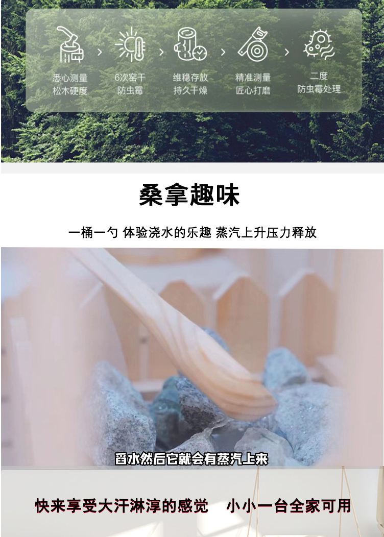 雙人桑拿房的加熱方式:以桑拿爐為核心,搭配火山石。通過(guò)電爐絲加熱火山石,再往石頭上潑水產(chǎn)生蒸汽,還原經(jīng)典桑拿體驗(yàn),適合喜歡高濕度、強(qiáng)出汗感的用戶(hù)。